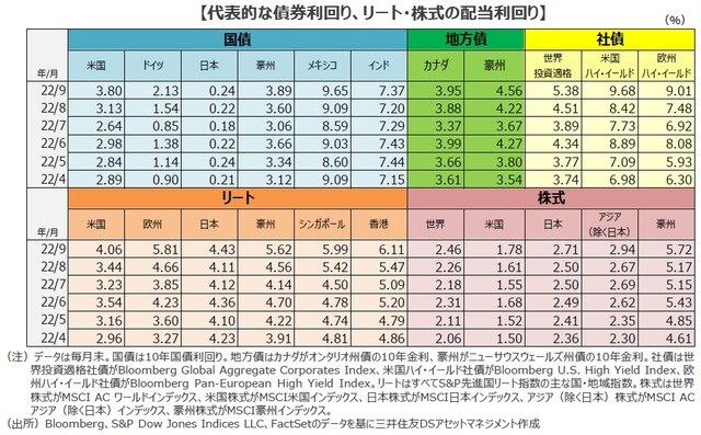 ■2022年9月は債券、株式、リートの主要3資産全てで利回りが上昇しました。