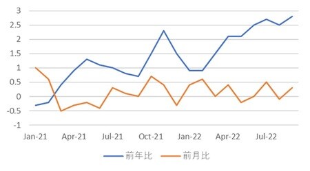 PPIについては前年比0.9%上昇と、8月の2.3%から低下し、2021年1月以来の低い伸びと市場予想を下回った。グローバルには、主要中銀が相次いで利上げを実施する中で、中国のインフレ率上昇は限定的である。