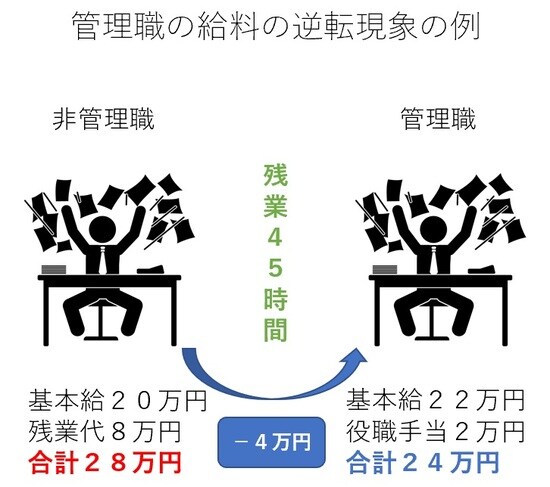 管理職になって、給料が下がる(減る)場合には、違法となる可能性があります(いわゆる「逆転現象」)。なぜなら、労働基準法上の管理監督者として、時間外手当や休日手当などの残業代を支給しないことが許されるためには、「対価の正当性」が認められる必要があるとされています。