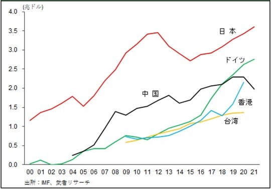 その結果、日本は国内の停滞とは裏腹に海外投資を積み上げ、突出する世界最大の対外純資産国となった。いわば大英帝国と同様、「海外資産による金利生活国」となったのである。