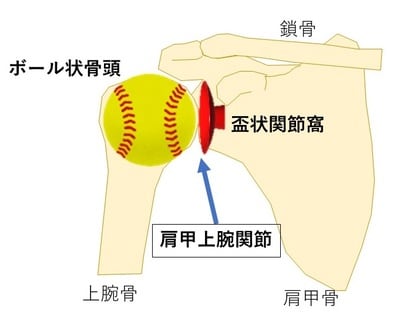 肩関節は肩甲骨と上腕骨でできた球関節です。肩甲骨の関節面(関節窩)は小さくて浅く窪んでおり、上腕骨の関節面(骨頭)は大きな半球状であるため、「盃とソフトボール」のイメージです(肩甲上腕関節)。