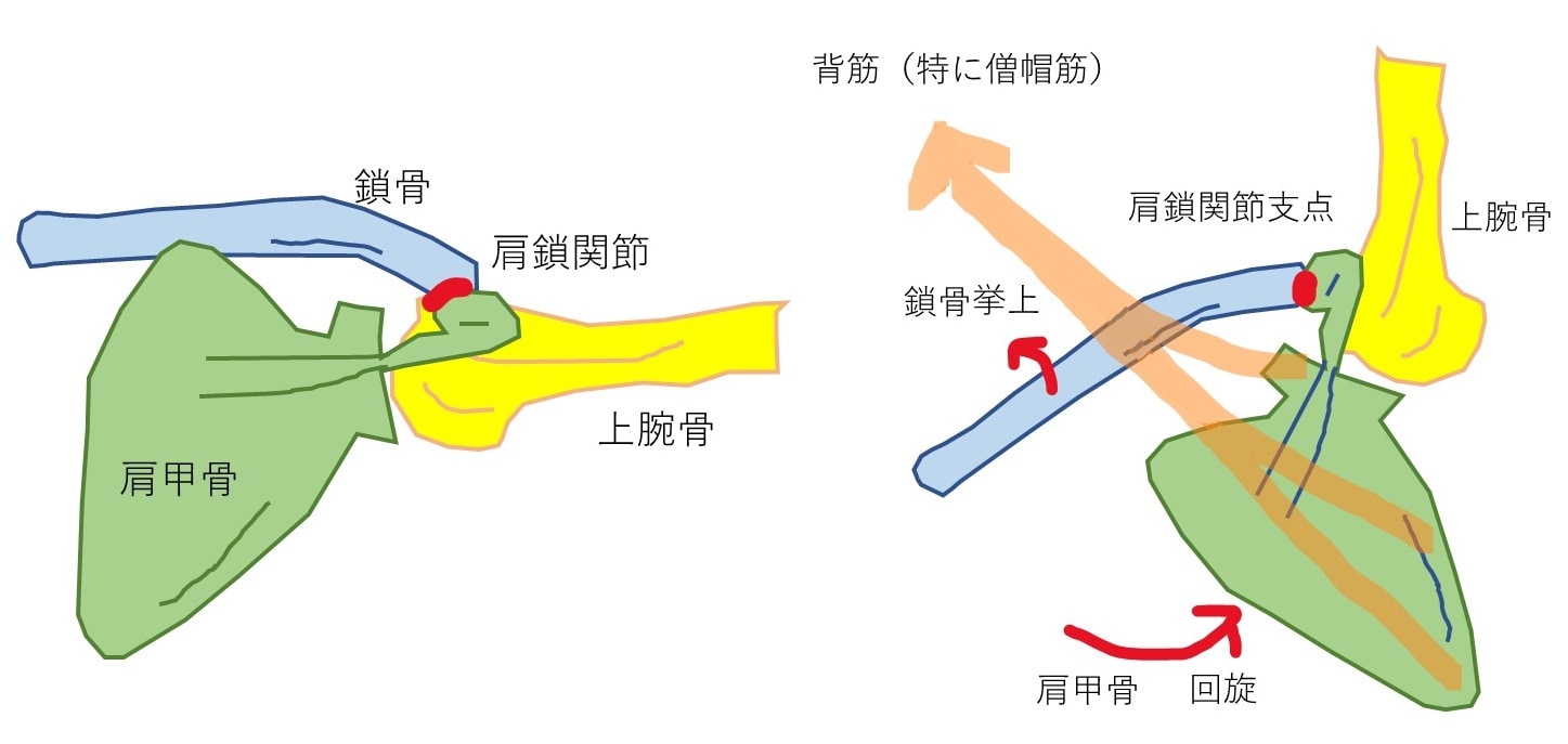さらに肩鎖関節を支点に、脊椎背筋(特に僧帽筋)の力で肩甲骨が振れる(回旋)ことによって、腕は広い可動域を得ます。