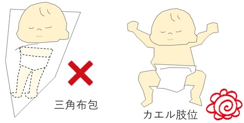 ちなみに、赤ちゃんを三角布で包んでお披露目していた伝統的習慣は、股関節が伸展して股関節脱臼の原因になることがわかりましたので、いまは股関節と膝関節を屈曲させた姿勢(カエル肢位)が推奨されています。