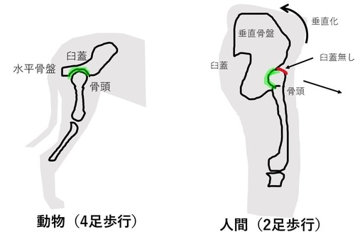 加えて、人間は四足歩行から直立二足歩行へ進化した際に、股関節も水平から垂直化しているため、脚は解剖学的に前方に脱臼しやすくなっているのです。