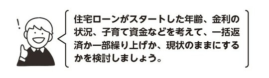 また、間を取って「一部繰り上げ返済」も可能ですので、毎月の返済は減らして少し現金を残しておくというのも有効な考え方だと思います。