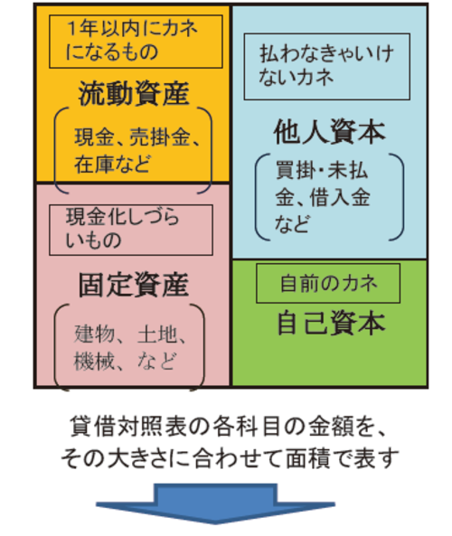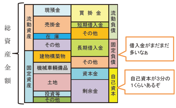 借入金はどれくらいあるのか、自己資本は全体のどれくらいを占めているのか?といったことが、一目でわかるようになります。それぞれの項目を色分けして、見やすくする、ということも、理解・判断を早めるポイントです。