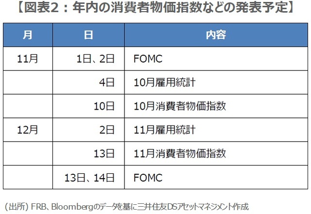 ただ、パウエル議長が次回の利上げ幅縮小を市場に織り込ませることに成功しても、前述の通り、実際の利上げ幅はデータ次第となるため、物価動向や雇用情勢の見極めが引き続き重要となります。12月FOMCまでに、10月分と11月分の消費者物価指数と雇用統計が発表されますが(図表2)、物価の高止まりや、雇用の底堅さが確認される結果となれば、利上げ幅縮小の期待が後退し、株式市場が不安定になる恐れもあるため注意が必要です。