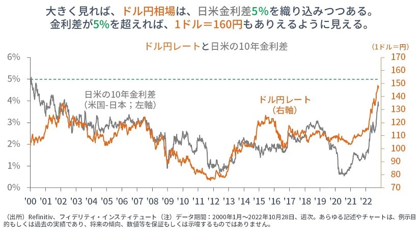 そう考えると、今後、ドルの長期金利が5%を超えるなかで、ドル円相場も短期的には160円あたりまで上昇するかもしれません。