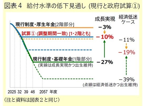 この仕組みの下、2009年と2014年に続き2019年の将来見通しでも、厚生年金(2階部分)よりも基礎年金(1階部分)で給付の引き下げが長引き、大きく低下する見通しになっている(図表1)。
