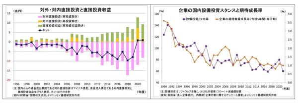 ただし、国内企業の「日本経済に対する期待」が低迷し続けていることも、収益機会を求める企業の海外展開を後押しした可能性が高い。実際、日本企業のキャッシュフロー(CF)に対する国内設備投資額の割合は日本経済の中期的な期待成長率(企業による予想)と連動する形で低下・低迷してきた。