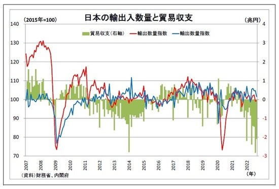 また、日本企業による海外投資へのシフトは貿易取引を通じても円安を促したと考えられる。昨今の本邦貿易赤字の主因がエネルギー価格の上昇であることは明らかだが、企業の生産能力が国内から海外へシフトしたことによって、アベノミクス開始以降、輸出に有利な円安が進んだにもかかわらず、輸出が伸び悩んだ。輸出の伸び悩みが昨今の貿易赤字拡大を増幅し、実需の円売り(ネット)を拡大させた面がある。