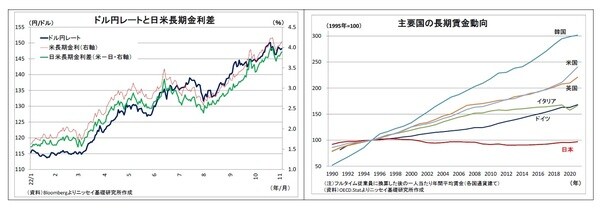 円安の進行について、直接的な要因として挙げられるのは「日米金利差の拡大」と「本邦貿易赤字の拡大」だが、その背後に日本経済の根深い問題が存在している点も見逃せない。