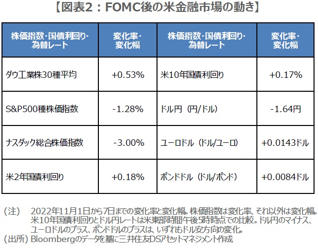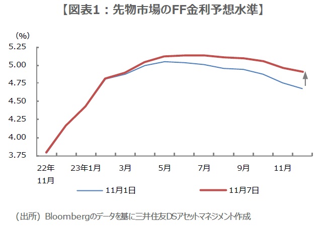 FOMC声明では、利上げペースについて政策浸透の時間差を考慮する旨の文言が新たに加わり、市場は総じてこれをハト派的と受け止めました。一方、パウエル議長は記者会見において、フェデラルファンド(FF)金利は、9月のFOMCで示した到達点よりも高い水準に達する可能性に言及し、利上げ停止の議論はかなり時期尚早と述べるなど、タカ派的なコメントが目立ちました。