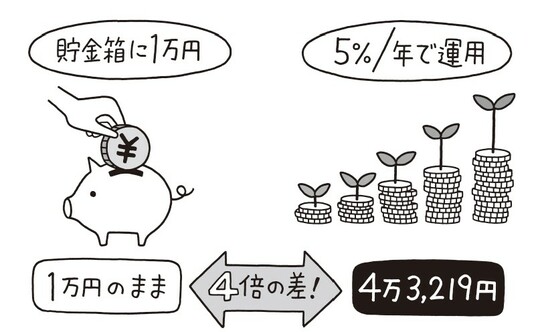 1人は家の貯金箱に大切に入れていたのに対し、もう1人は、「金融リテラシー」を身につけ、5%で運用できたとする。