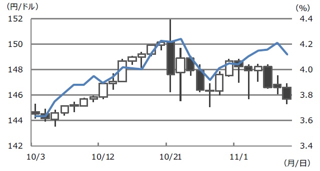 直近のドル円相場の動きを振り返ると、10月21日に1ドル=151円95銭水準をつけた後(取引時間中、以下同じ)、ドル高・円安の動きが一服し、11月8日には145円31銭水準まで、ドル安・円高が進みました。背景には、①政府・日銀によるドル売り・円買い介入が10月21日と24日に実施されたとの観測、②米利上げ幅の縮小期待による米長期金利の低下、があると思われます。
