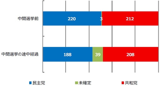 上院で両党48、下院で民主党188、共和党208の議席を確保した模様、ほぼ予想通りの展開