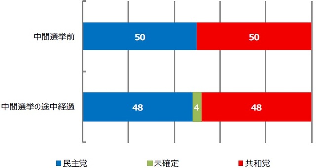 米国では11月8日に中間選挙が行われ、一夜明けた9日も開票作業が続いています。上院は今回、定数100議席のうち、3分の1が改選されます。民主党の改選議席数は14(非改選36)、共和党の改選議席数は21(非改選29)です。報道によると、米国東部時間の午後7時(日本時間の11月10日午前9時)時点で、当選確実は民主党が12、共和党が19となっており、非改選議席を含め民主党と共和党が共に48議席を確保した模様です(図表1)。
