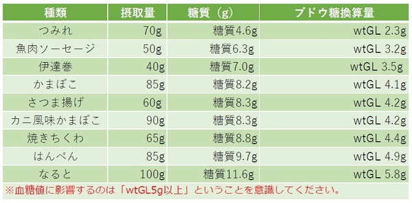 ここではRGIでは表現していません。『80キロカロリーガイドブック』(女子栄養大学出版部)を参考に、それぞれの80kcalの重さと炭水化物含有量からwtGLを計算しています。練り物のGl値の報告はさまざまですが、ざっくりと50%で計算して大きな間違いはないと考えています。
