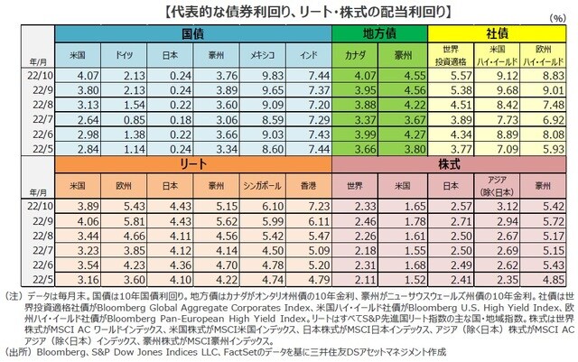 ■株式やリート市場では、FRBの利上げペース減速への期待などから米国や日本で株式やリートの価格が上昇し、配当利回りは低下しました。ただし、中国では習近平総書記が異例の党トップ3期目入りを果たし、今後の政策運営において経済の優先度が後退するとの懸念などから、株式やリートの価格が下落し、配当利回りは上昇しました。