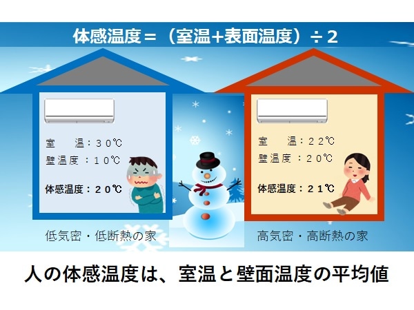 つまり、【図表3】のように、左側の低断熱の家では、冬にエアコンが頑張って30℃まで暖房しても、壁面が外気の影響で10℃まで冷たくなっていると、人の体温が壁面に奪われて寒く感じ、体感温度はその平均の20℃になってしまいます。これを「冷輻射」といいます。右側の高断熱の家では、エアコンが22℃まで暖房して、壁面温度が20℃で維持されていれば、体感温度はこの平均で21℃ということになります。温度計で測ると左側の家の方が8度も室温が高いのにもかかわらず、右側の家の方がむしろ暖かく感じるのです。そして、床暖房がなくても足下が寒いということがないですし、エアコンが必要以上に頑張らなくてもいいので、エアコンの風も穏やかで、不快に感じることも少なくなります。