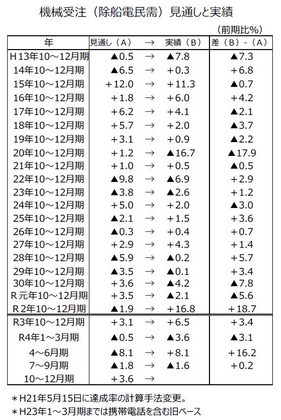●機械受注(除船電民需)7~9月期の前期比見通しは▲1.8%であったが、実績は▲1.6%と僅かに上振れた。前期比実績は09年(平成21年)から21年までの13年間でみると、上振れ10回、下振れ3回であり、上振れしやすい傾向がある四半期であるが、今年も何とか上振れた。