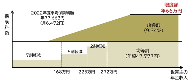 そして、「均等割」と「所得割」を合計した額が最終的な保険料になります。2022年度の全国平均保険料率は、「均等割」が 47,777円、「所得割」が 9.34%です。また、保険料には上限が設定されています。上限額は2022年時点では年66万円です(【図表3参照】)。