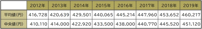 2012年以降でみると、2012年は平均値416,728円・中央値410,110円だったのが、2019年には平均値460,217円・中央値451,120円と、7年間で約10%も上昇しています(【図表1】参照)。また、2022年分はさらに上昇するものとみられます。