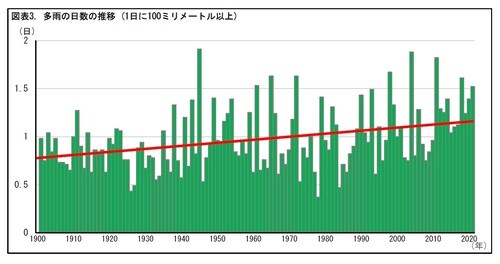 1日100ミリメートル以上の日数は増加傾向、1ミリメートル以上の日数は緩やかな低下傾向となっている。多雨の日が増える一方で、雨の日自体は減っている。その分、降水のない(正確には雨量が1日1ミリメートル未満)の日が増えていることとなる。つまり、降水量は変化していないが、多雨や乾燥といった極端な降水の頻度は増加傾向にあると見ることができる。