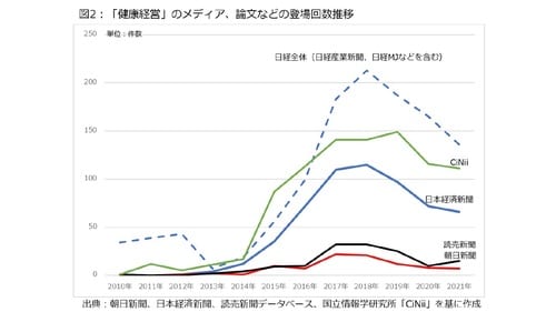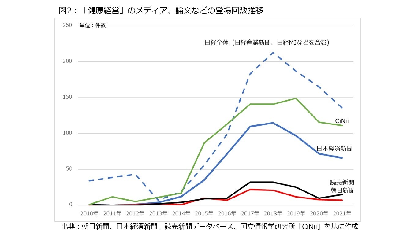 次に、健康経営に関するメディアの登場回数を見ると、少し面白い動きとなっています。図2は3紙(朝日新聞、日本経済新聞、読売新聞)のデータベース、国立情報学研究所が運営するデータベース「CiNii」を用い、「健康経営」という言葉が登場した回数を表しています。