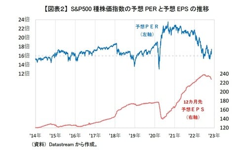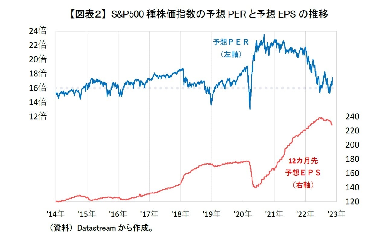 そして2つ目は弱含んだ米国企業の利益予想である。2022年が始まる前は金融引締めが行われても業績拡大が株価を下支えし、米国株式は堅調という予想が一般的であった。それがいざふたを開けてみると2022年は金融引締めが急激すぎた面もあるが、それに加えて企業業績も堅調とはいかず、特に年後半は利益予想の下方修正が続いた。S&P500種株価指数の12カ月先予想EP(赤線)をみても、6月以降は横ばいもしくは低下していることからもそのことが分かる【図表2】。