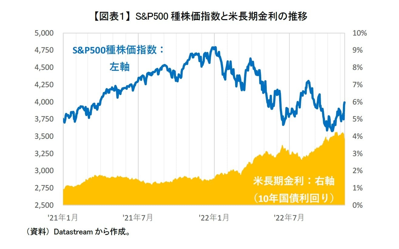 まず、①つ目は米国でインフレが収まらず、金融引締めが急ピッチで行われ、急激に金利上昇したことである。米長期金利(面グラフ)をみると2022年初には1%台後半にあったが、10月には一時4%を超えた【図表1】。そこから上昇が一服したといっても、依然として3.8%台と高水準にある。