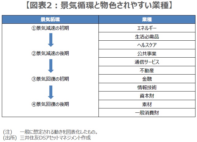 次に、景気の4局面毎で、一般的に物色されやすい業種をまとめたものが図表2です。景気減速の初期から景気減速の後期にかけては、エネルギーや生活必需品、ヘルスケアや公益事業が物色されやすいと考えられます。もちろん、実際には必ずしもこの通りになるとは限らないため、セクターローテーションを考えるにあたっての、1つの目安ということになります。