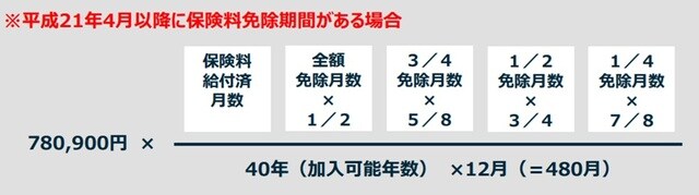 なお、基礎年金の国庫負担割合が2009年に3分の1から2分の1に引上げられたため、保険料の免除期間に関する計算式が、2009年3月以前とその後で変更されています。