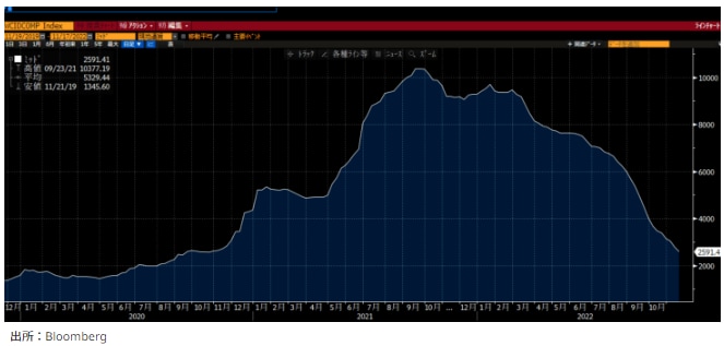 インフレの要因である供給制約もかなり解消されてきた。代表例が海運市況。コンテナ価格は急低下、コロナ前の水準に接近している。