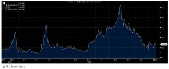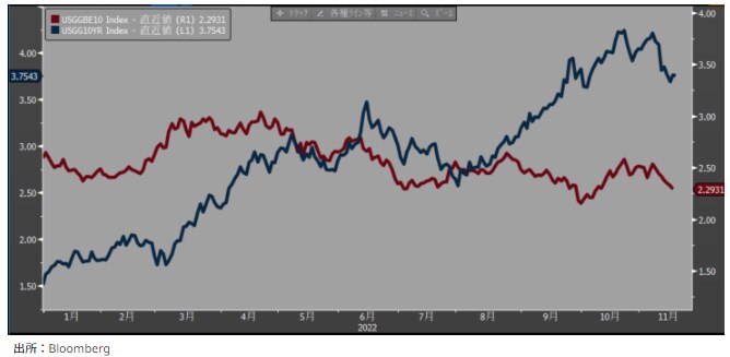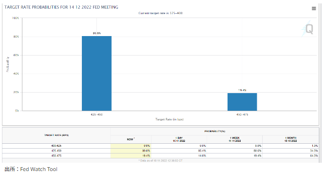 [1]のFEDのスタンスについても、FRB副議長のブレ―ナード氏がブルームバーグのイベントで、「恐らく利上げペース減速への移行が近く適切になるだろう」と発言するなど、タカ派の修正がみられる。こうしたことから市場が見込む次回FOMCでの利上げ幅は0.50%との予想が8割を占める。1ヵ月前は、0.75%が3分の2で、0.50%の予想は3分の1しかなかったことからは大きく変化した。