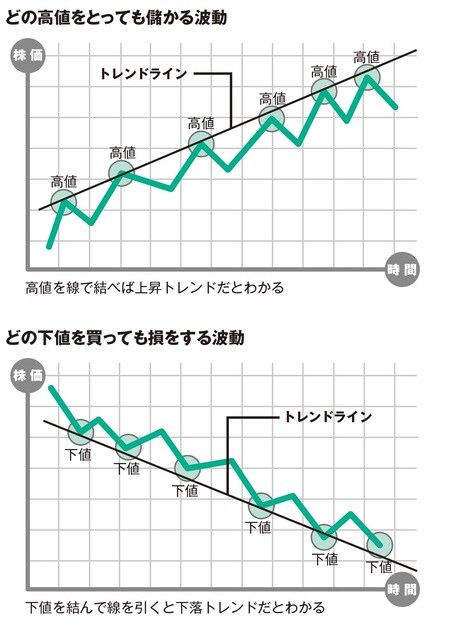 株価が上昇の波のサイクルにあるときは、どの高値をつかんでも天井をつけるまで儲けることができます。反対に下降する波のサイクルのときは、どの安値を買っても底入れするまでは損をします。