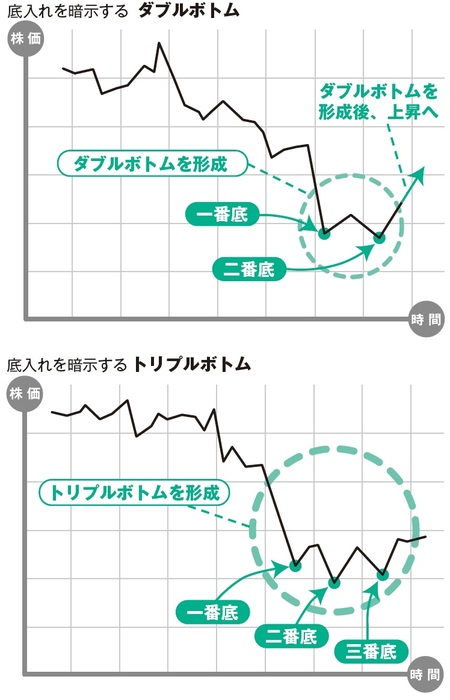 株価は、1回の下落だけでは底入れしません。2回目の下落を経てはじめて底入れするのがセオリーです。1回目の底を一番底、2回目の底を二番底と呼びます。2度、谷ができることで「底入れ近し」と読めるのです。谷が3つできるトリプルボトムもありますが、確率的にはダブルボトムで底入れを示唆する場合が多いでしょう。