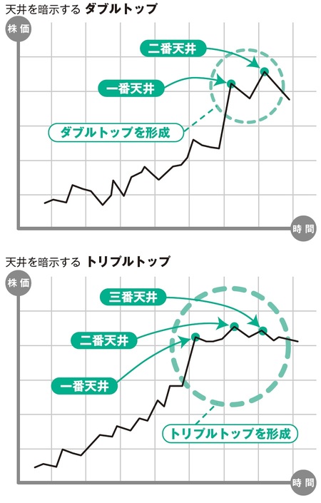 2度、山ができることで「天井」近しと読めます。山が3つできるトリプルトップもありますが、確率的にはダブルトップで「天井」を示唆する場合が多いでしょう。