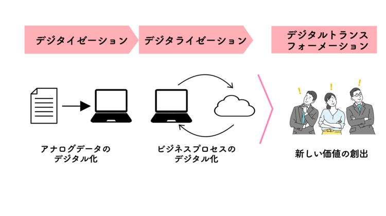前述の通り、デジタル化はDXのスタート段階に過ぎません。デジタル化からDXに至るまでの過程は、「デジタイゼーション」・「デジタライゼーション」・「デジタルトランスフォーメーション」の3つに分けられているので、それぞれ解説します。