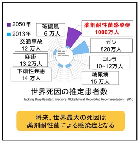 薬剤耐性菌感染症は将来世界最大死因となると予想されており、薬剤耐性菌感染症による死を防ぐためには、個々人の意識も重要です。