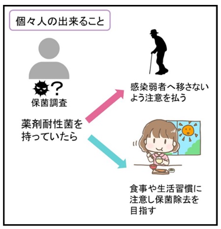 個々人でできることとして、「潜伏するタイプ」の感染症における薬剤耐性菌の対策となりますが、実際に薬剤耐性菌を保菌しているか調べるということがあります。もし保菌していれば、高齢者など感染症が悪化しやすい感染症弱者との接触に注意することにより、それらの方へ薬剤耐性菌が移ってしまい、発症して亡くなってしまうことを防ぐことができます。デルタ株の頃の新型コロナウイルス感染症でも行われた、無症状であっても感染しているか調べて、感染していれば感染症弱者への接触を控えるということと同様のことです。