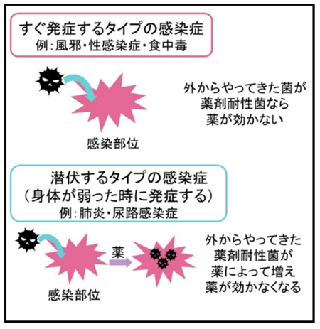 「潜伏するタイプ」の感染症の場合、外からやってきた菌が身体に潜伏することになります。外から入ってきた菌が薬剤耐性菌であった場合、抗生物質を飲むことで、通常の菌が死んでいき、薬剤耐性菌が増えていきます(菌交代といいます)。そうして、身体が弱ったときに、それらが症状を引き起こすことになります。したがって、「潜伏するタイプ」の感染症の場合は、薬を飲んでいることで、薬剤耐性菌が「生まれる」のではなく、「選択されて」しまい、薬が効きにくくなるということがあります。