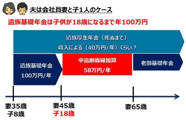 妻:それでも、子どもが18歳になると、遺族基礎年金がもらえなくなってしまいますから、奥様の生活が苦しくなりますよね。