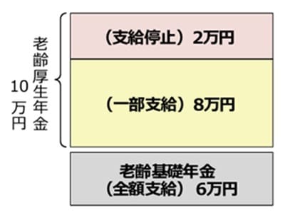 K先生:たとえば、老齢厚生年金の基本月額が10万円、総報酬月額が41万円だったとしましょう。これらを足すと51万円です。これは47万円という金額を4万円だけ超えています。この4万円の2分の1、すなわち毎月2万円の老齢厚生年金が減額されることになるのです。