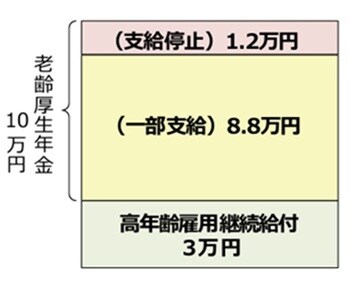 下記の図表2を見てください。この方のケースでは、老齢厚生年金が合計で月額1.2万円支給停止となり、勤め先からの賃金(月額20万円)と老齢厚生年金(月額8.8万円)と高年齢雇用継続給付(月額3万円)を足して、月額31.8万円が合計の収入となります。