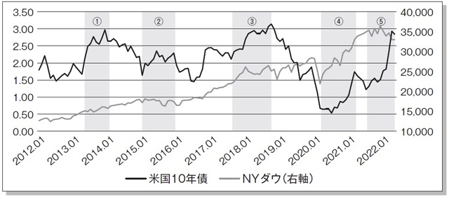 ただし、ここで注意しなくちゃならないことがある。それは、金利が上がったのに株も好調に上がることも多いということだ。金利上昇が明らかに景気の回復によるものである場合だ。こんなときには「金利上昇によるマイナスを差し引いてもおつりがくるくらい企業利益が増加する」と期待されるからだ。この点には注意が必要だね。ほら、図表2のグラフでも①、④のときは金利が上がっているけど株価も順調だ。でも②や③、それに⑤のときは金利の上昇が株価の頭を押さえているよね。