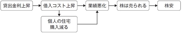 もちろん、金利上昇で損をするのは企業だけじゃない。個人だって、特に長期の住宅ローンを借りようとしている人なんかは、ローン金額を抑えたりしてワンサイズ小さな住宅で我慢する。そうすると、不動産・住宅関連企業の業績は振るわない。だから、それを見越して株も売られて安くなる(図表1)。