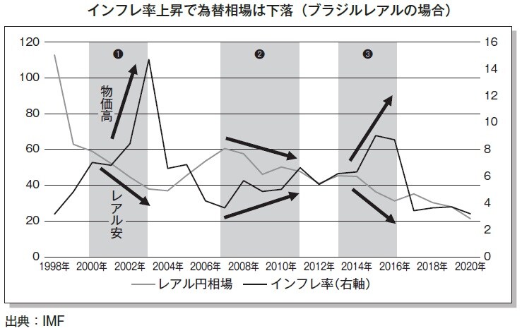 とすると、外国為替市場でも通貨としての本来の価値がより大きく減ったレアルが売られて下がるのがあたり前だ。つまり、「インフレ率が高い通貨は売られて下がる」。これが原則なんだ。