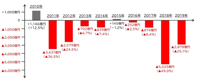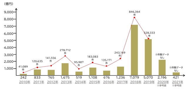 これによると、2018年(7,079億円)と2019年(5,070億円)が突出し、2020年の2,196億円がそれに次ぐ数字となっています。