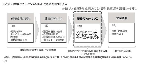 現在、従業員の健診受診率、ストレスチェック受検率等といった法人による健康経営の実施状況や、適正体重維持者率、血圧リスク者率等といった個人の健康のアウトカムは、健康経営度調査で収集している。しかし、アブセンティーイズム、プレゼンティーイズム、ワーク・エンゲージメント等の従業員の業務パフォーマンスは取得していない(図表2)。